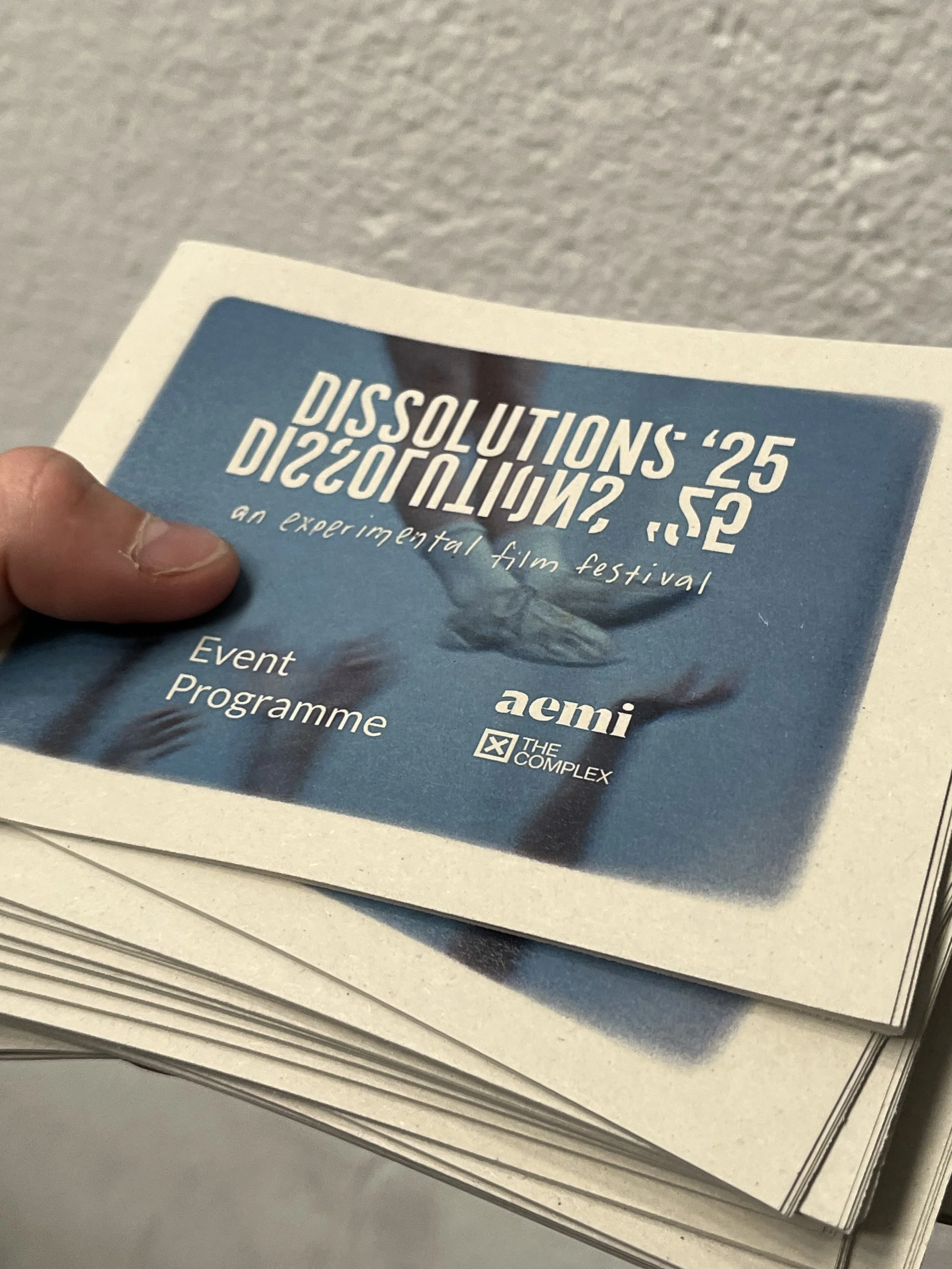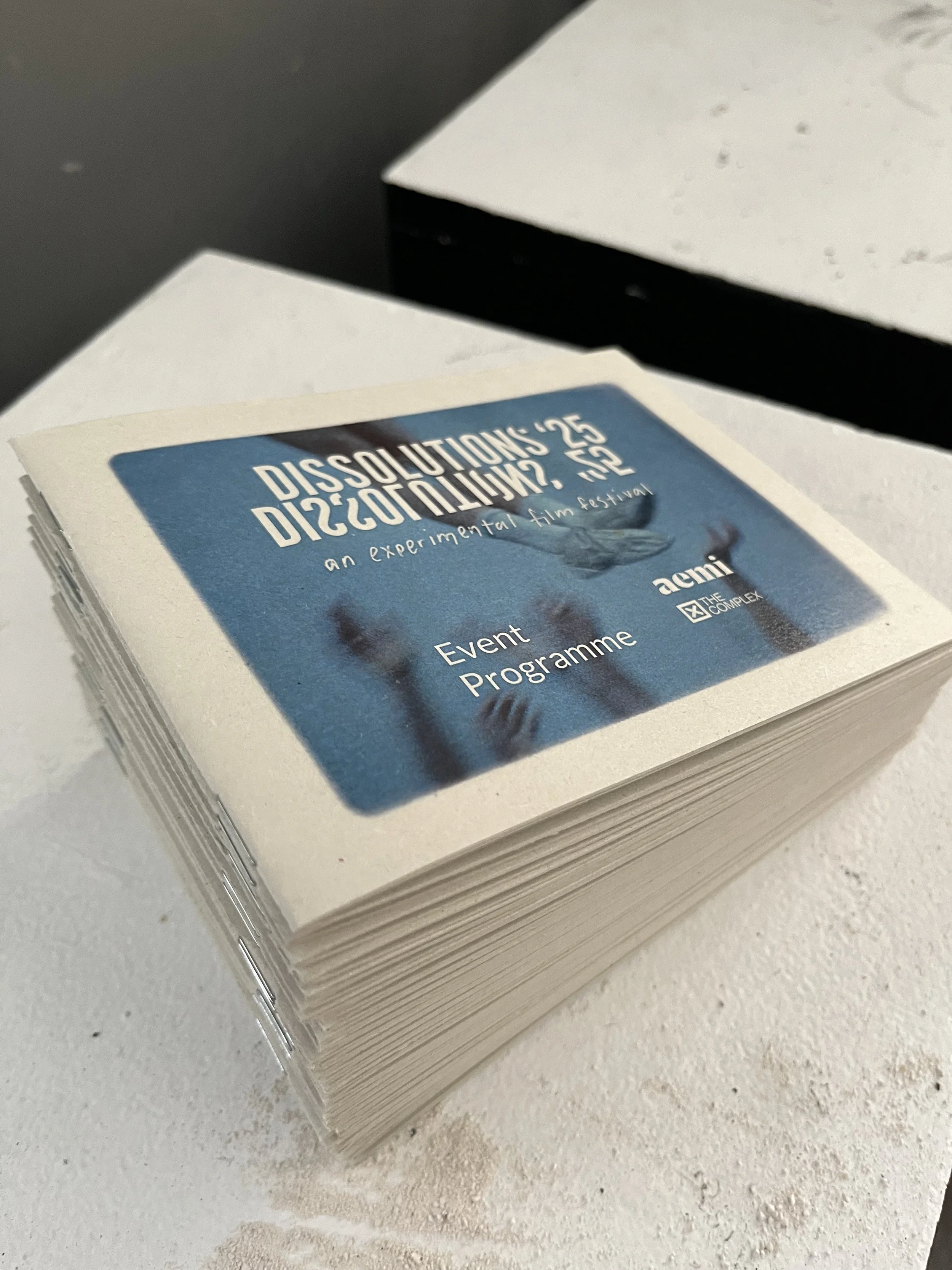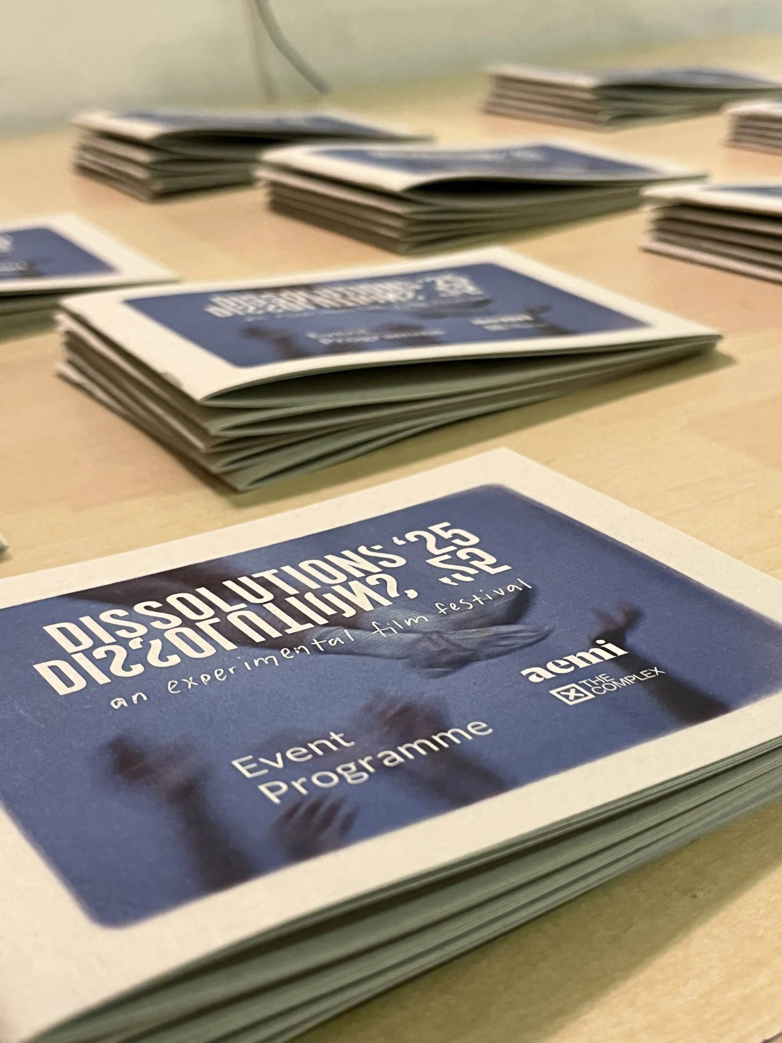 I worked aemi to produce the visual identity for Dissolutions 25’. This year we expanded on the assets of the identity which were developed in the previous year. We used excerpts of footage from Laida Lertxundi’s 16mm film workshop at Dissolutions 2024 as a visual for both printed and digital elements of the identity. Modifications to the logo and further experimentation with colourful risograph printing were also completed to develop Dissolutions ‘25.