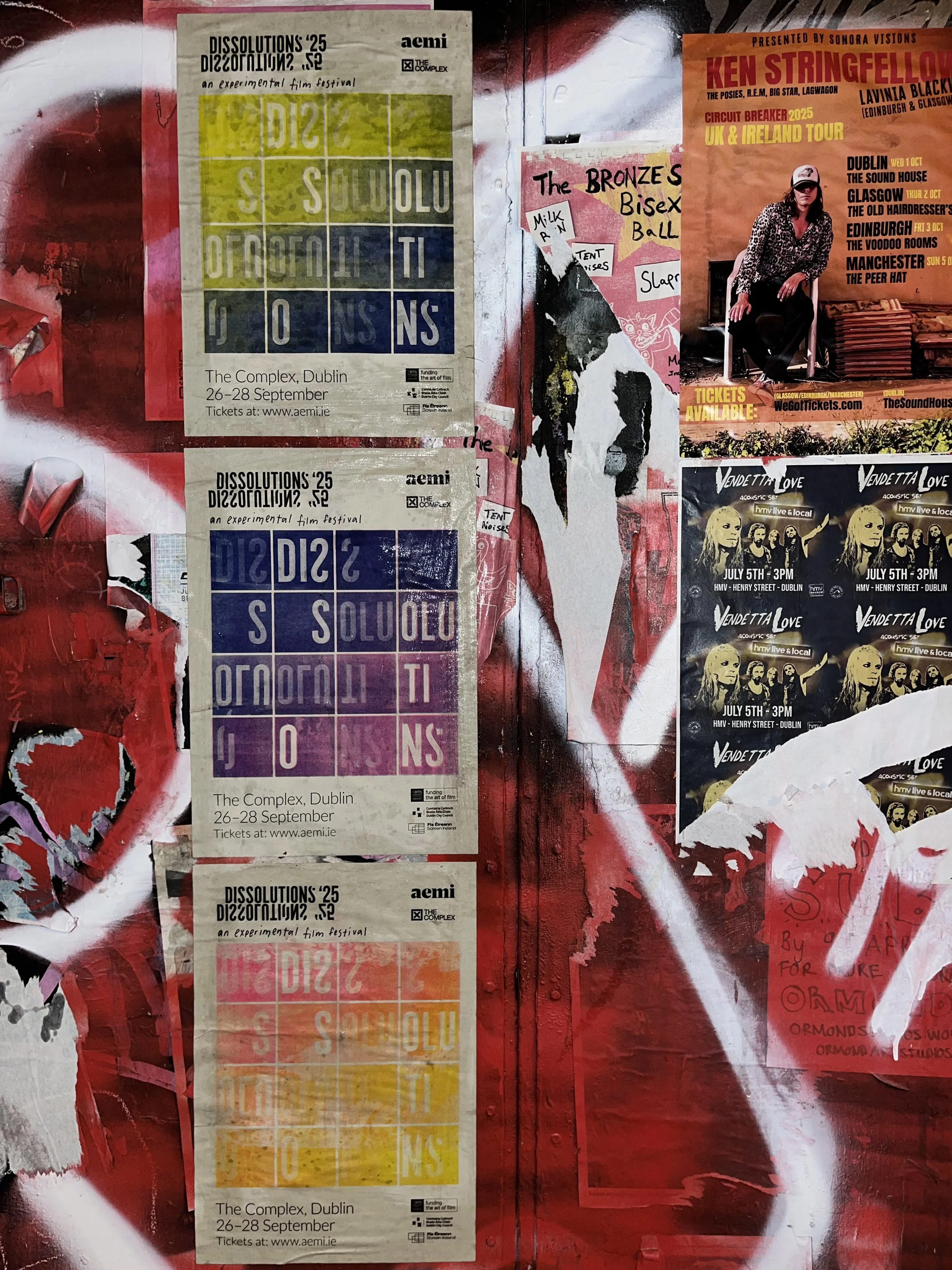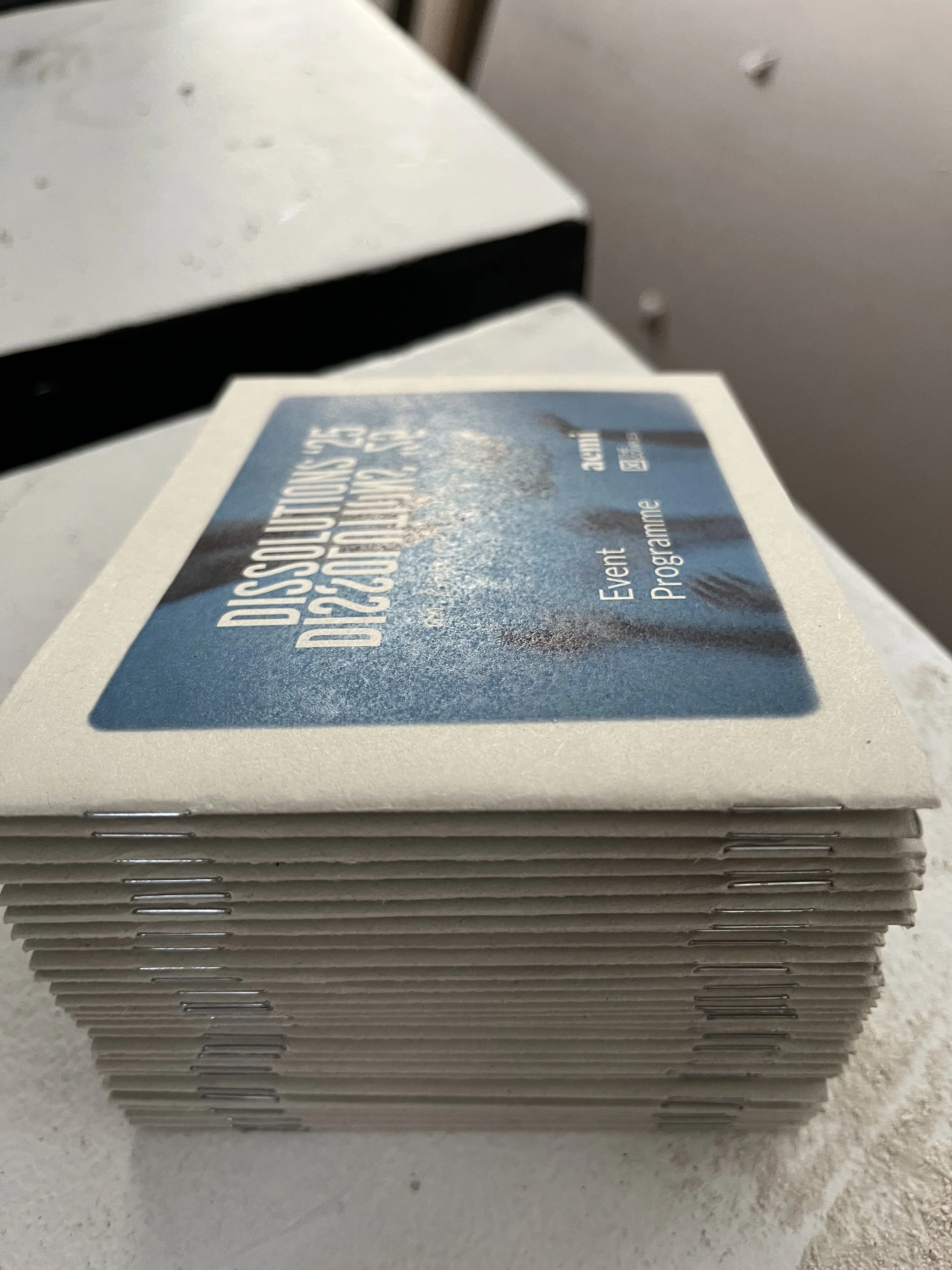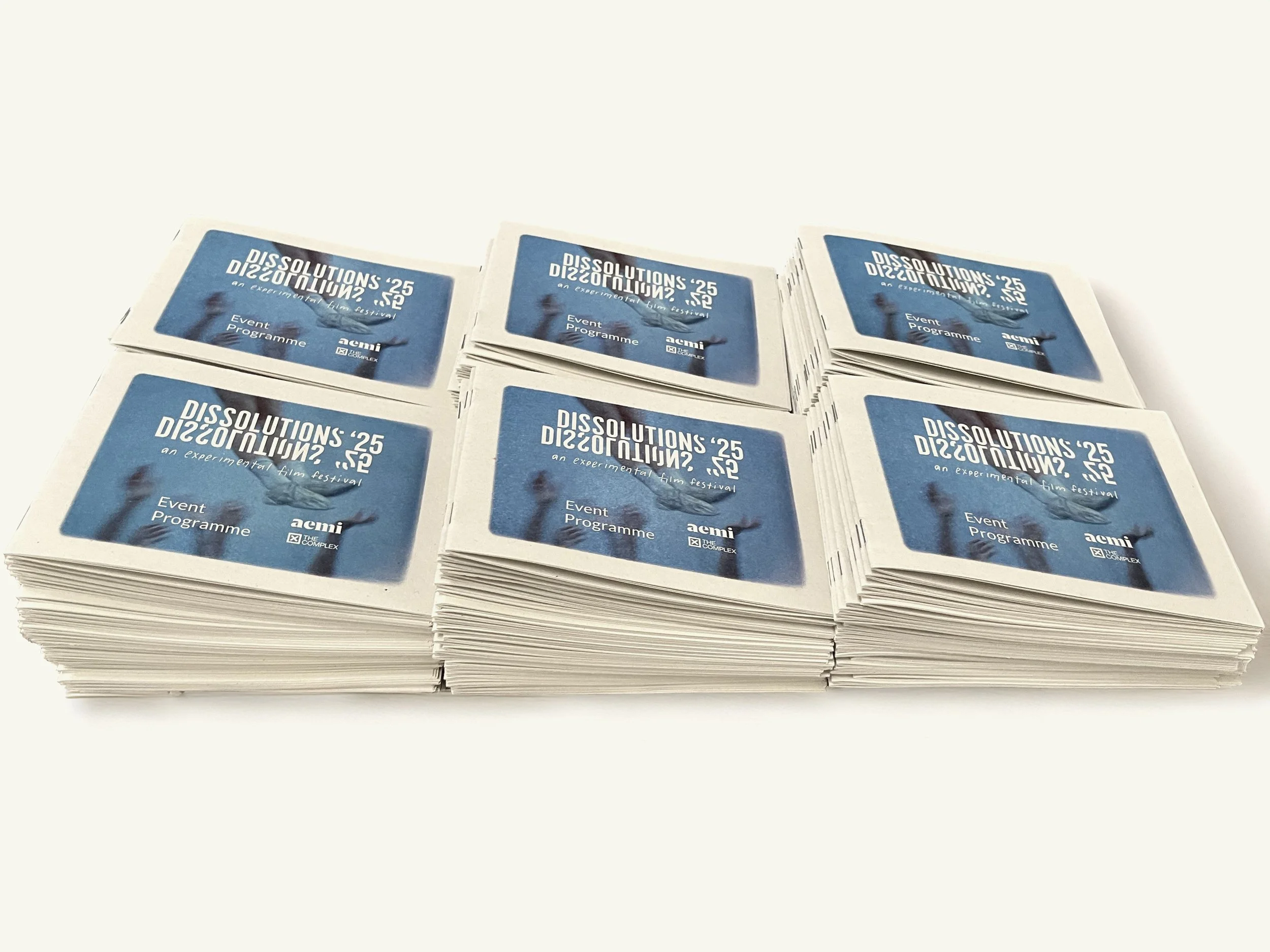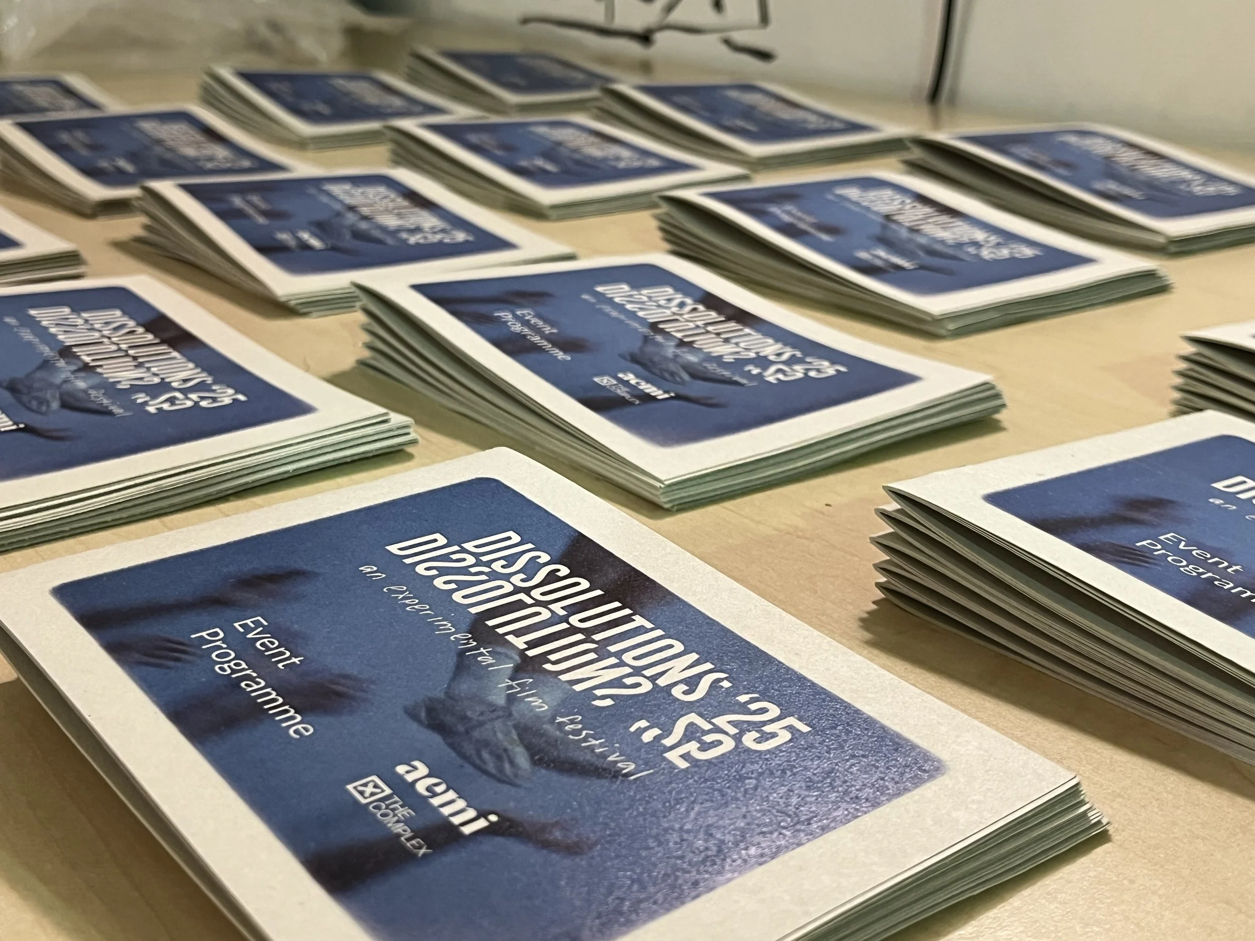 I worked aemi to produce the visual identity for Dissolutions 25’. This year we expanded on the assets of the identity which were developed in the previous year. We used excerpts of footage from Laida Lertxundi’s 16mm film workshop at Dissolutions 2024 as a visual for both printed and digital elements of the identity. Modifications to the logo and further experimentation with colourful risograph printing were also completed to develop Dissolutions ‘25.